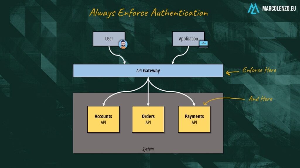 For instance, never ever enforce authentication at the function level. We must use certified or well-known libraries or solutions that enforce authentication at the component or system level. I would suggest placing an API Gateway in front of our applications so we can enforce authentication right there; at the entry point of our system.
