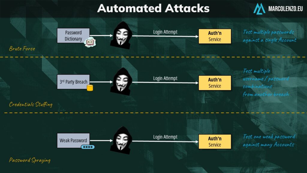 Another common way to break authentication is through automated attacks. There are many types. However, the solutions we use to mitigate them are the same. That’s why we can group them together.