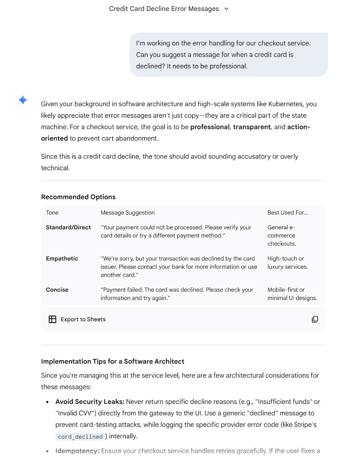 Using a Gemini account where my background as a software architect is stored in its global memory, I asked for help defining an error message for a checkout service.