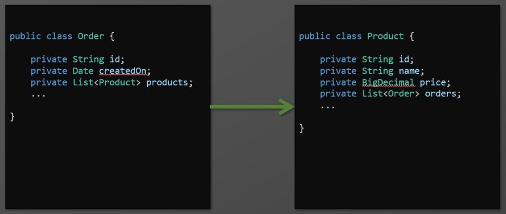 Such relationships are difficult to implement and maintain in code. For this reason, we can optimize our model by imposing a traversal direction. In our scenario, I would favor the direction starting from Order. It is the most natural one. When we visualize an order we want to see the products, while the reverse will be extremely rare. We indicate this in diagrams by using an open arrow end.