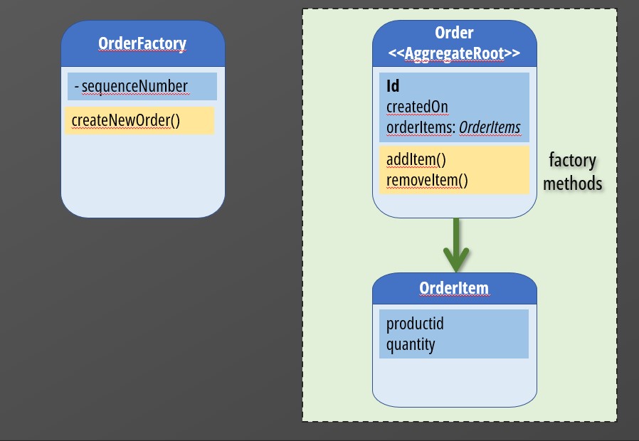 When the model starts growing large, we use aggregates to group a set of closely related entities. We establish a boundary and a root which we use to control all access to the objects inside. This way we can simplify our model by allowing references only to Aggregate Roots and we can guarantee sanity of the entire aggregate as a whole. Order and Order Item are a perfect example of an aggregate, where Order is the root.