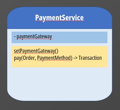 A Service is a stateless operation whose interface is defined by other elements of the model. The service stands alone in the model and has no associations. We could create a service that accepts an Order and PaymentMethod, perform the actual payment and returns the transaction details.
