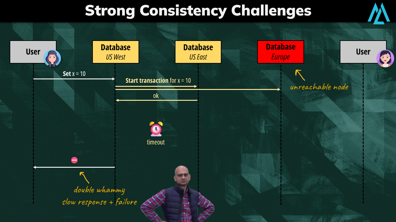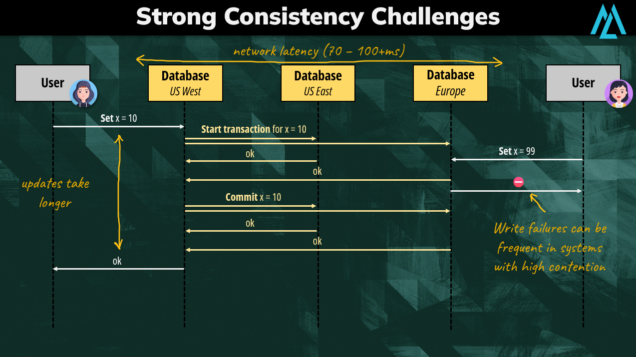 The other challenge is scalability. If two users perform updates at the very same time in different nodes, strong consistency must guarantee that only one update is successful. This can cause more failures in systems that have heavy contention on “writes”.