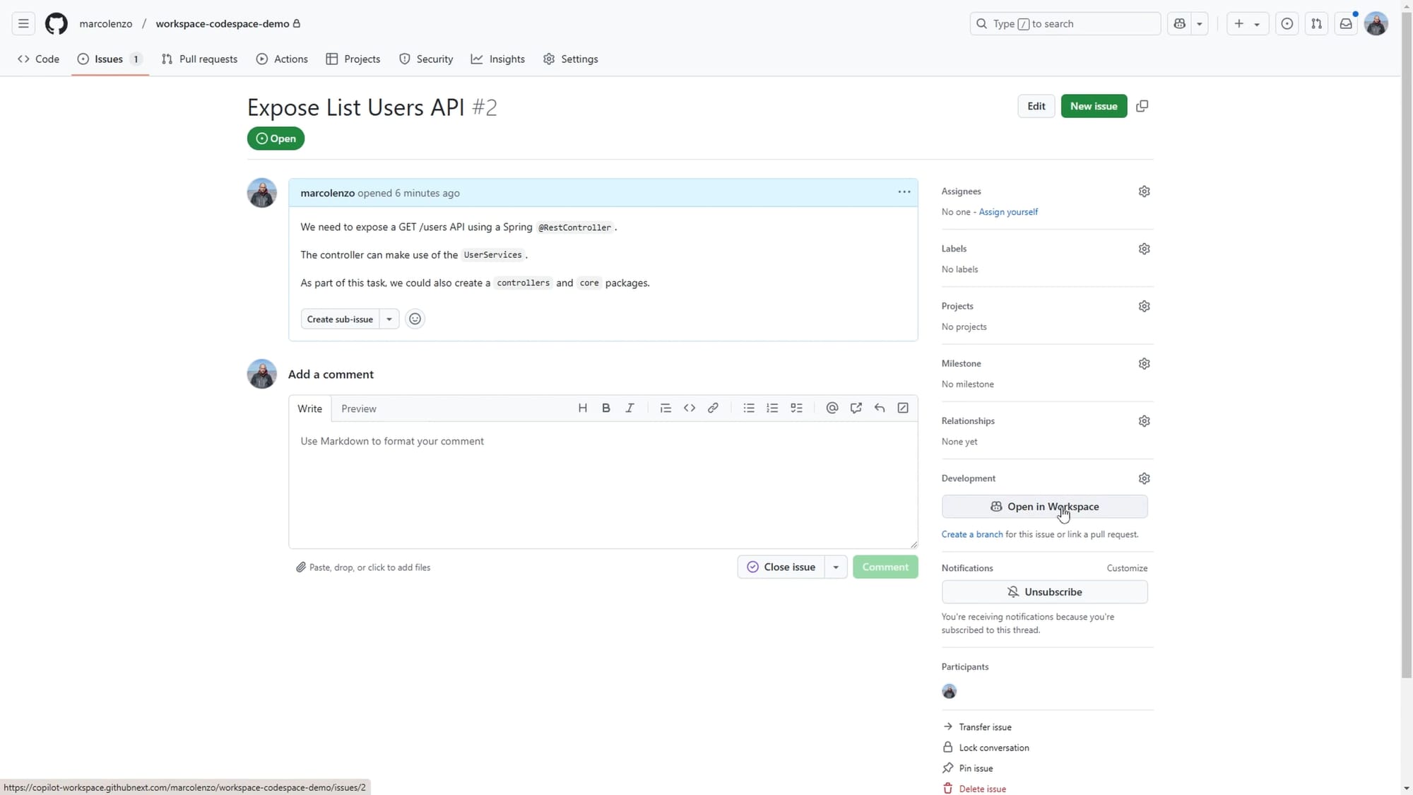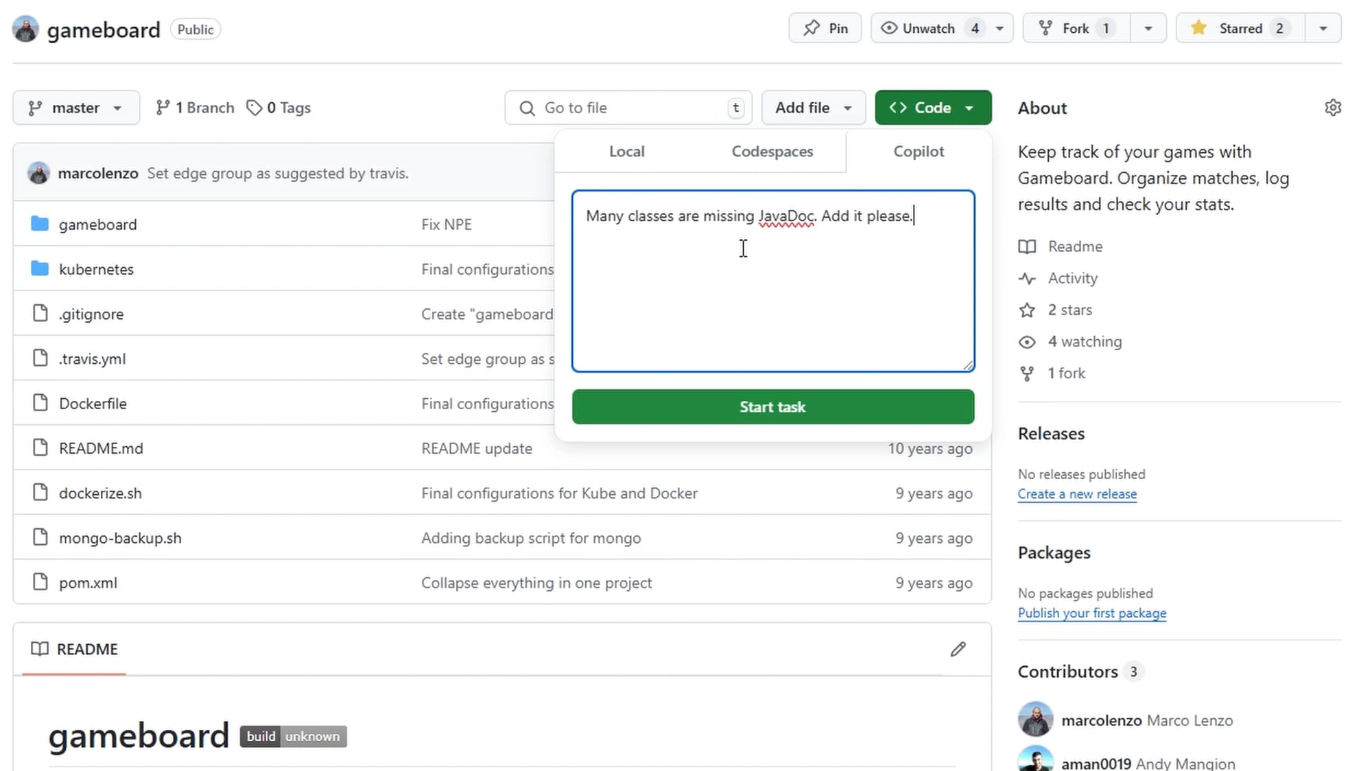 Let’s say you have an old, undocumented repository. You can simply task Copilot to generate your JavaDocs, and a workspace will be created.