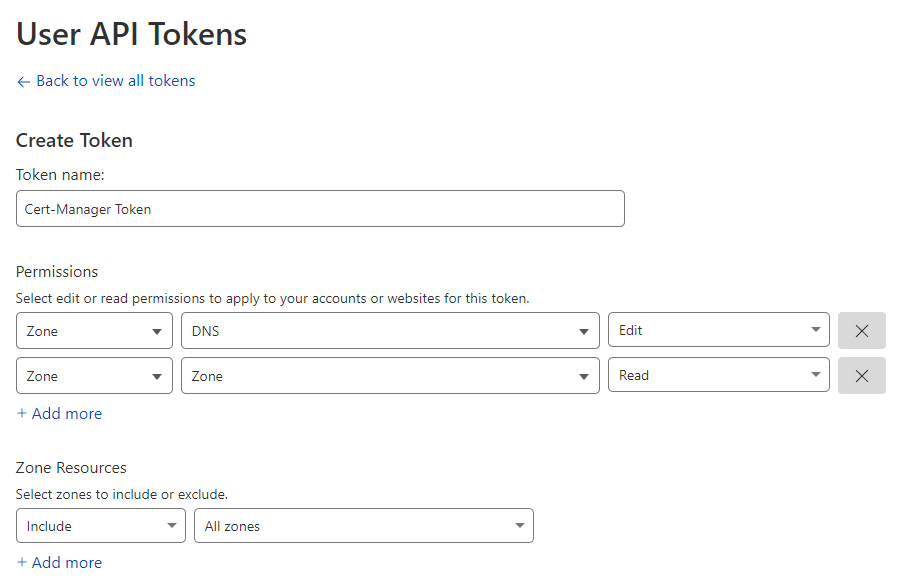 To prove domain ownership using the DNS-01 challenge, we’ll need to provide cert-manager with a Cloudflare API token. This token allows cert-manager to create a TXT record under the domain for which we’re requesting a certificate.