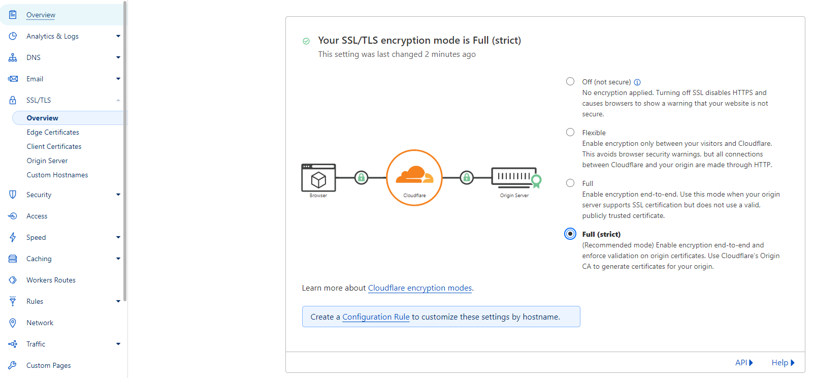 The reason we need a valid certificate on our backend is to enforce Full (strict) encryption for our website on Cloudflare. Without this setting, all our efforts would be in vain, as Cloudflare would accept a self-signed certificate on our backend.
