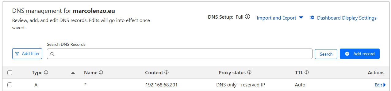 I then create DNS records for the restricted domains, directing them to internal private IPs. While the safest approach would be to use an internal DNS server to manage these records, I find it more convenient to use Cloudflare. Even though I have an internal DNS server, managing the records on Cloudflare simplifies the setup allowing me to generate valid TLS certificates for my services without an internal trusted authority. And in case you’re wondering, yes—Cloudflare does allow the use of private IPs.
