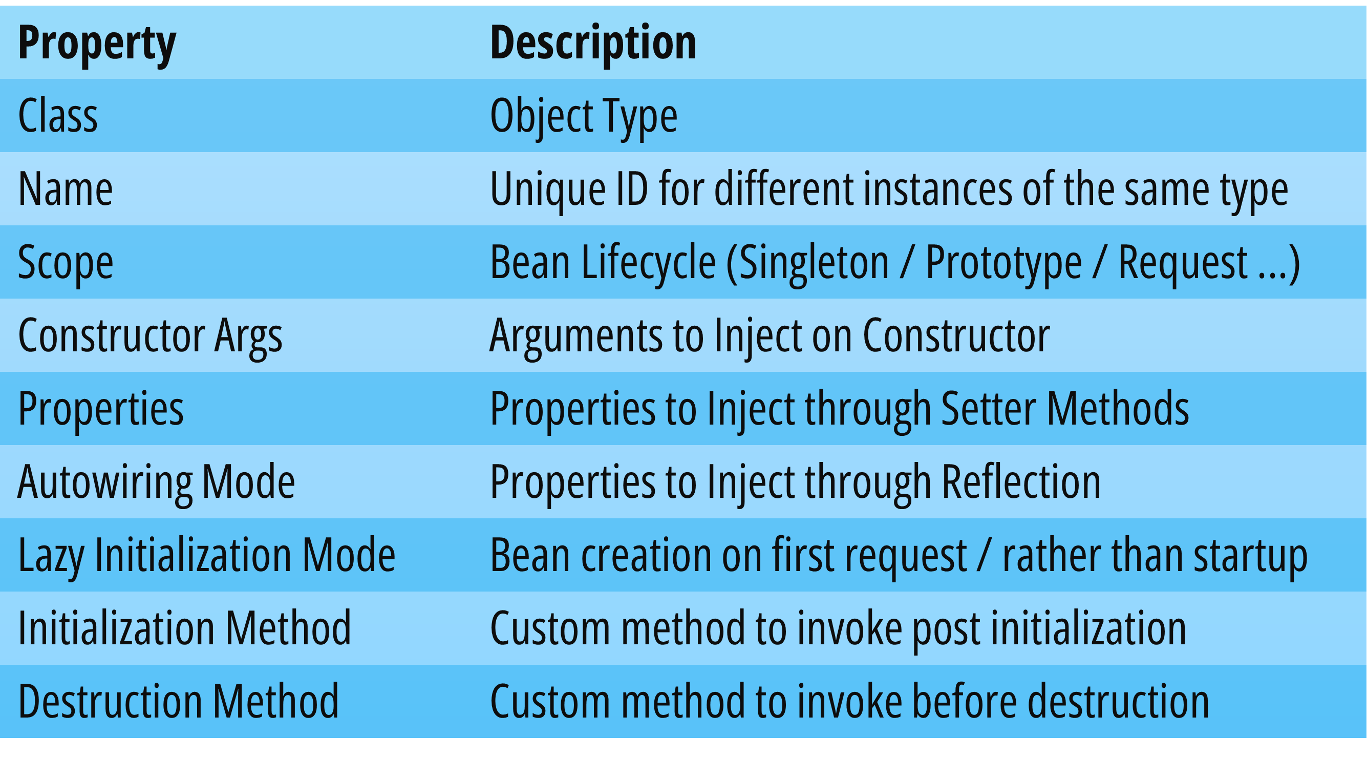 The configuration metadata is parsed by the Spring IoC container and translated into BeanDefinitions. A bean is simply an object that is created and managed by the framework. As you can see there are several properties that characterize a bean. The most important ones are class, name and scope.