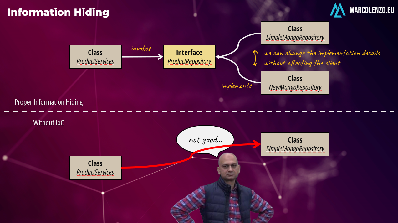 We can only comply with this requirement with proper information hiding. In simple words, we need to define a control flow where interactions with the application core are governed by interfaces. It’s then the framework that is responsible to wire these dependencies at runtime. Without IoC this is not possible because we would reference concrete classes rather than interfaces.