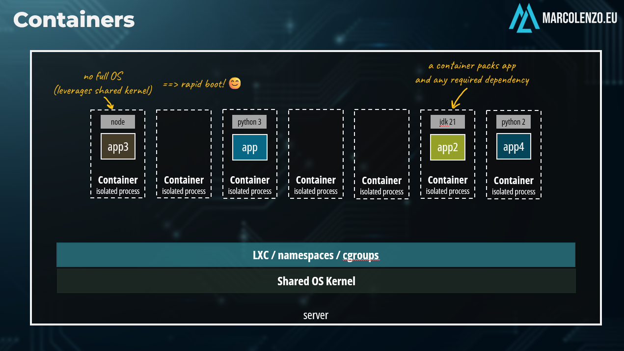 Containers start in seconds because they don’t need to boot an entire OS. This makes them ideal for dynamic scaling and frequent deployments. - Isolation with Cgroups and Namespaces