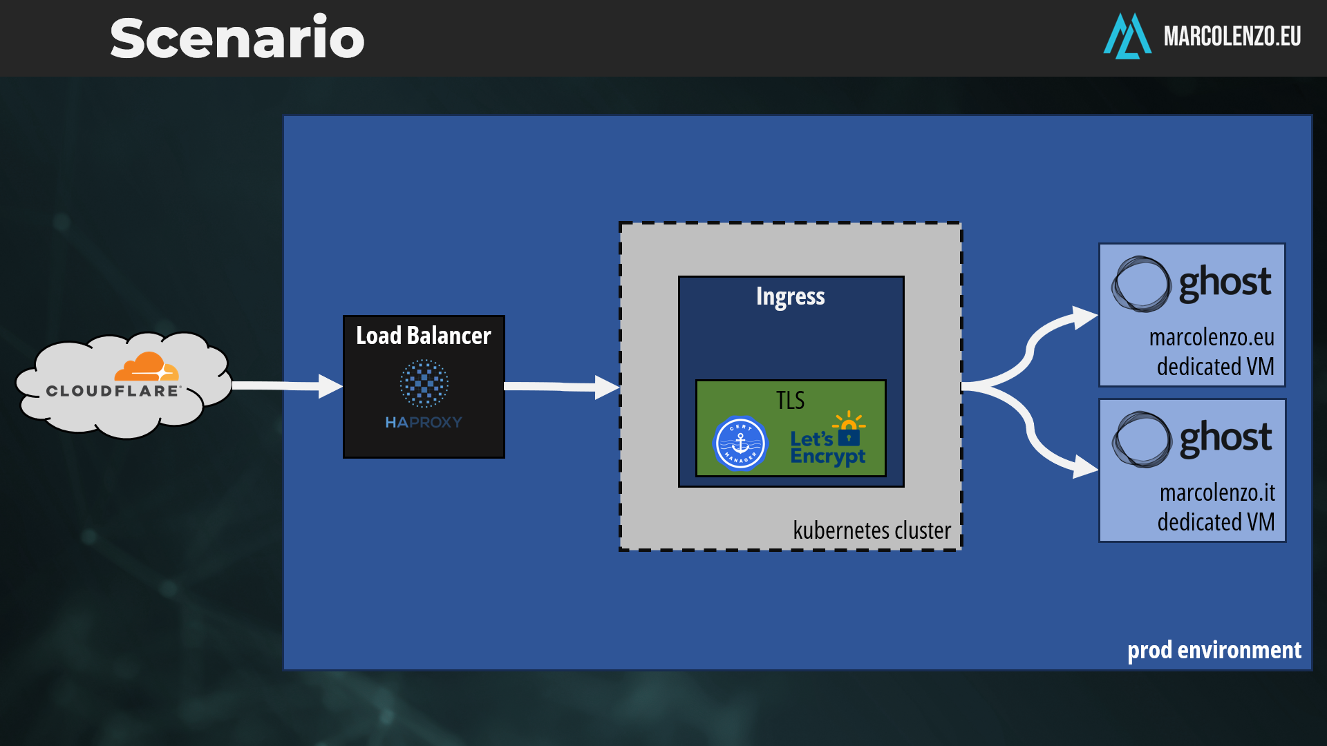 apiVersion: networking.k8s.io/v1kind: Ingressmetadata:  annotations:    cert-manager.io/cluster-issuer: letsencrypt-prod # triggers cert manager  name: ghost-ingressspec:  ingressClassName: nginx  rules:  - host: marcolenzo.eu    http:      paths:      - backend:          service:            name: ghost-service # our service with no selector            port:              number: 2368        path: /        pathType: ImplementationSpecific  tls:  - hosts:    - marcolenzo.eu    secretName: ghost-cert # cert is stored herestatus:  loadBalancer: {}