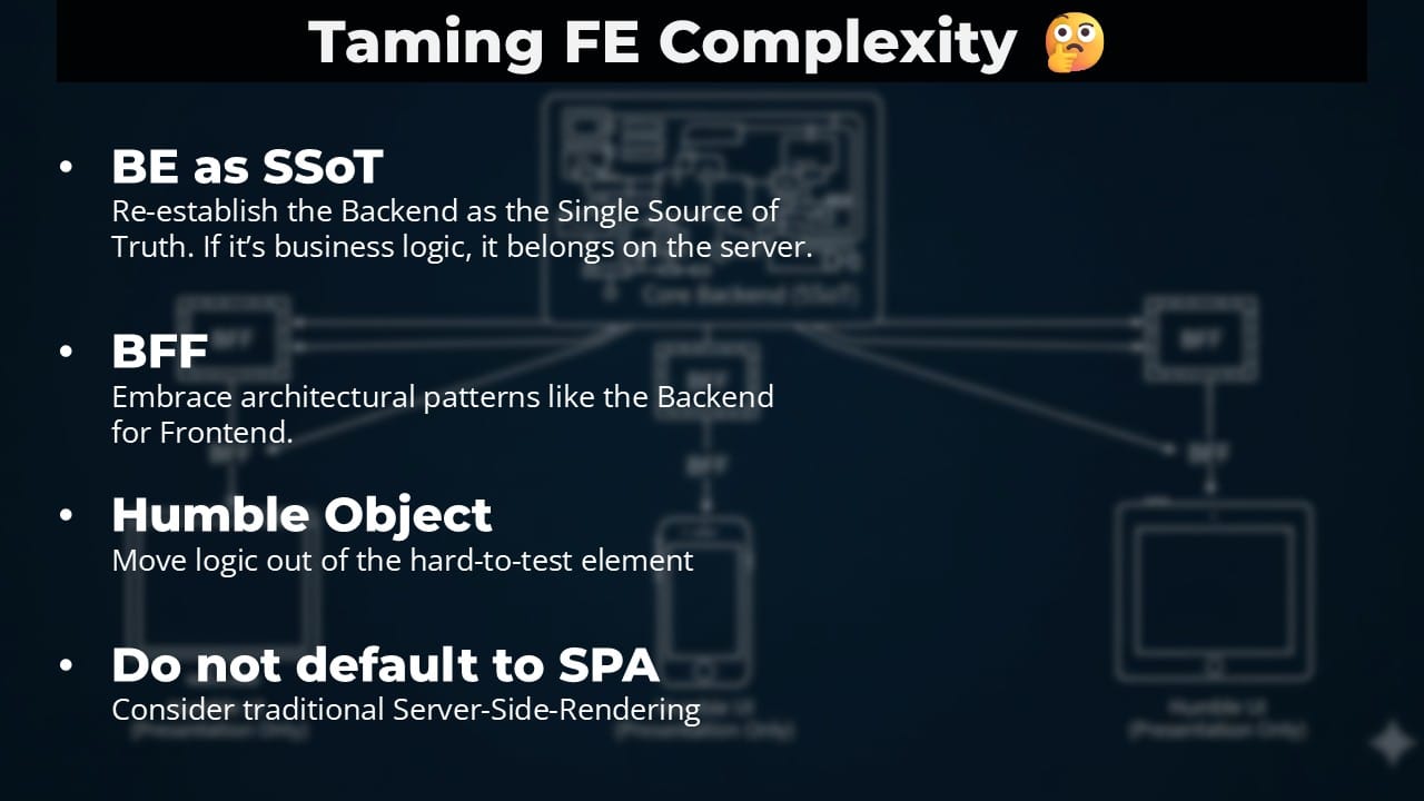 Another crucial step is to embrace the “humble object” philosophy. For every line of logic we consider adding to the frontend, we should ask ourselves: “Does this truly have to be here?” Very often, the honest answer is no.